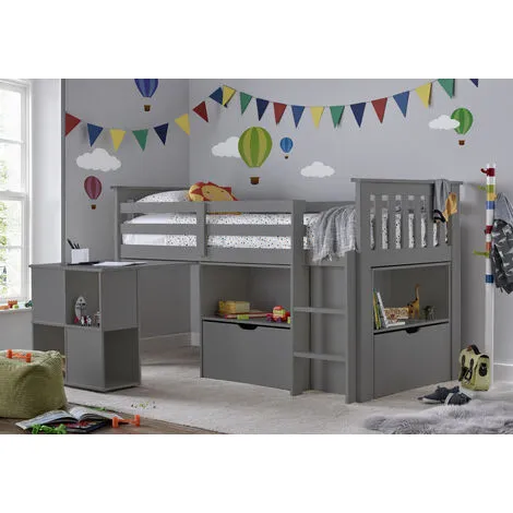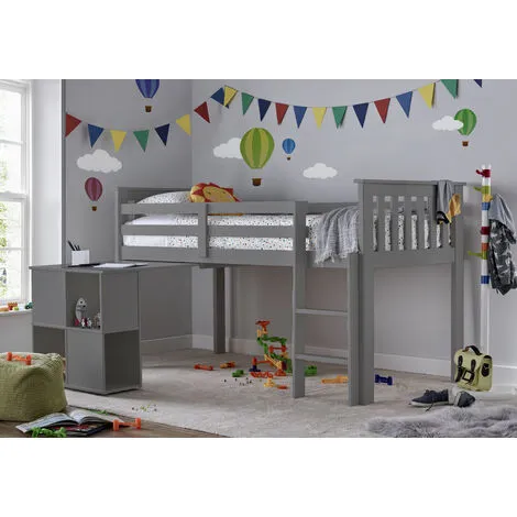 If you require more space in your children’s bedroom then the Mid Sleeper is perfect for you. A stylish and contemporary design means it is suitable for any bedroom. The Mid Sleeper includes a pull out desk and 2 shelving units with a drawer each. A perfect storage solution for your bedroom. The storage units can be used anywhere in the bedroom. This beautifully finished bed is constructed from quality pine and completed with a solid slatted base for extra mattress support. This cabin bed is complete with secure side rails for extra safety. The desk and ladder can be placed on either side. The desk can be pulled out as it has wheels and is secured by runners. This bed comes flat packed for ease of delivery and storage along with easy to follow assembly instructions. Length 206cm Width 109cm Height 120cm.