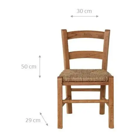 W30xDP29xH50 cm sized solid natural beech wood made, unpianted baby chair . Entirely hand made straw. Structured with four crosspieces under the seat, which give it strength and stability, it is ideal for any type of living. Entirely made in Italy crafted