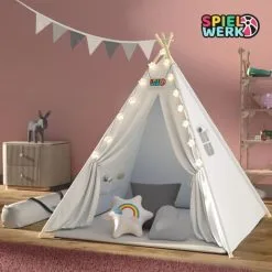 Spielwerk Children’s Teepee Tent Fairy Lights Kid’s 2.5cm Floor Play Mat 3 Pillows Cotton Carry Bag Tipi Playhouse Indoor 120x120x160cm Wigwam White