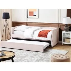 Beliani Modern Fabric EU Single Trundle Bed Frame Nailhead Trim 3ft Pink Mimizan