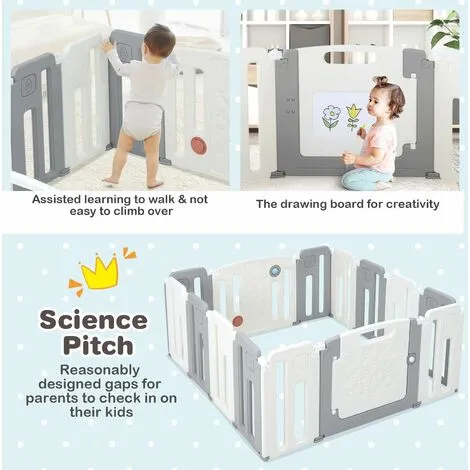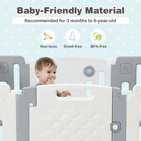 Our toddler safety yard has a sturdy and anti-skid frame with anti-slip/non-scratch bases that will not easy to move and slip. It has a door panel equipped with a safe door latch to lock your baby inside and with a drawing board behind the back for creativity. A 64cm height assists kids in learning to walk and is not easy to climb over. And the seamless corner design won’t trap the baby’s arm. Besides, the reasonably designed gaps are considered for parents to check in on their kids. Using baby-friendly material, this baby playpen is recommended for kids of 3 months to 6-year-old. The convertible shape covers large play areas for any room size while the foldable design is easy to store.. Press the buckle and twist the positioning knob to lock and secure the shape. With cute and decorative patterns and a rotating ball & sound button, your kids would love to stay inside while you can do your things.