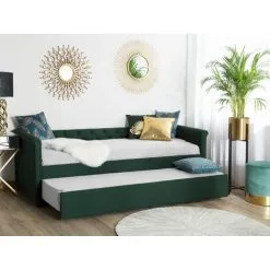 Beliani Modern Fabric EU Small Single Trundle Bed Frame Buttoned 2ft6 Dark Green Libourne