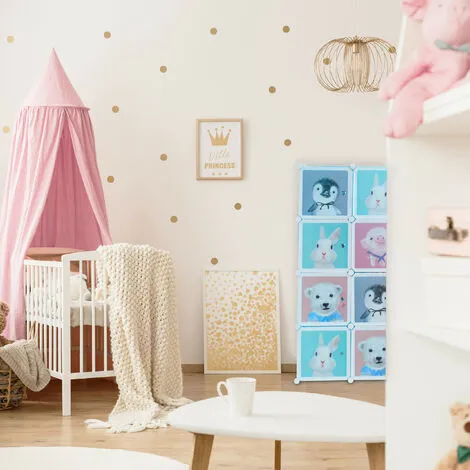 The large children’s shelf with cute animal prints will delight children and creates order. The wardrobe for the children’s room has 6 cube compartments and 2 high compartments with clothes rails. The doors of the blue wardrobe show different animals, including penguin, piglet, polar bear and rabbit. The cute cartoon characters will delight boys and girls alike. The standing shelf is based on a plug-in system and can be put together as desired.