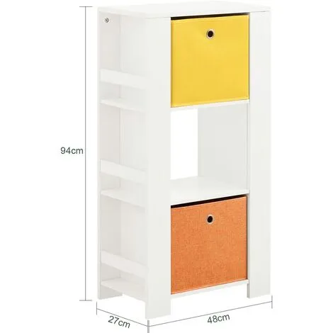 Made of high quality MDF in white lacquer. The 2 drawers are made of non-woven fabric—one is yellow and one is orange.