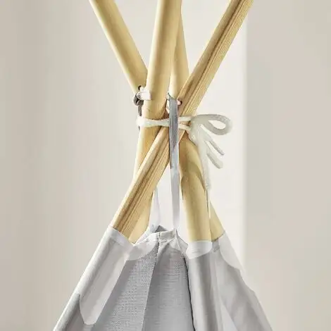 The tent and floor mat are made of polyester & cotton fabric; the poles are made of pine wood.