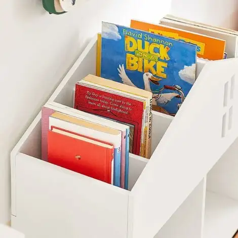 2 open compartments offer additional storage space for the books and toys.