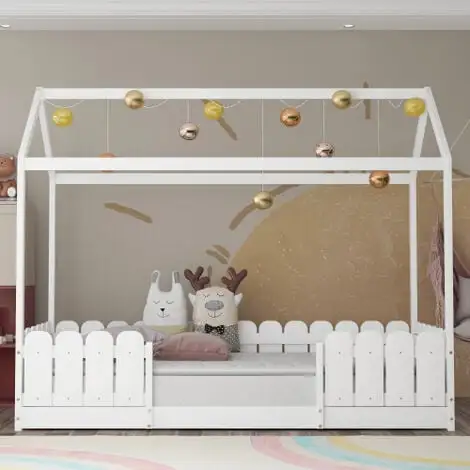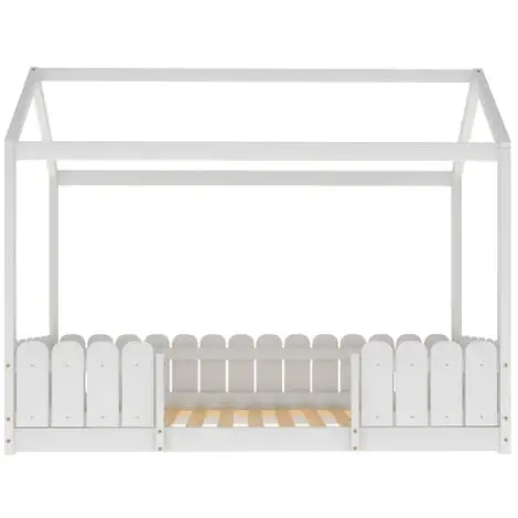 | Mit Dach und Zaun schafft dieses einzigartige Bett einen lustigen und bezaubernden Raum, der nicht nur als bequemer Schlafbereich dient, sonder auch als Platz für Ihre Kinder zum Spielen und Spaß haben. Das Oberflächenmaterial ist leicht zu reinigen, Mütter müssen sich keine Sorgen machen, dass Kinder Bilder auf den Bettrahmen zeichnen. |