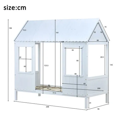 Hausbett, Kinderbett, Tagesbett mit 2 Fenstern, Kiefernrahmen, MDF- dach, weiß (200x90cm)