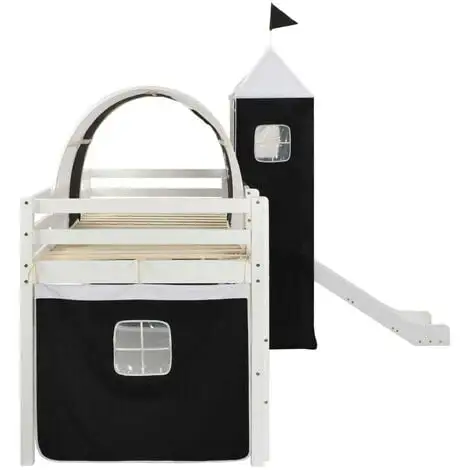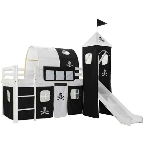 This pirate-themed children’s loft bed will be a real eye-catcher in your kid’s bedroom. The loft bed has a solid construction and is delivered with the bed slats, a slide, a ladder, and a pirate-themed tent, side covers and a canopy. Guard rails on both bed edges will keep your little pirate in his or her bunk. The space underneath the bed transforms into the captain’s headquarters with the included sidewalls with windows. Additionally, the loft bed is distinguished by an entertaining slide and a ladder, both of which can be covered with the included tent. The slide and the ladder can be assembled either on the left or right, and a canopy for covering the bed is also included. The bed is suitable for 90 x 200 cm mattress. Your little one will love sleeping and playing in his or her very own pirate fortress! Please note that the mattress is not included in the delivery.